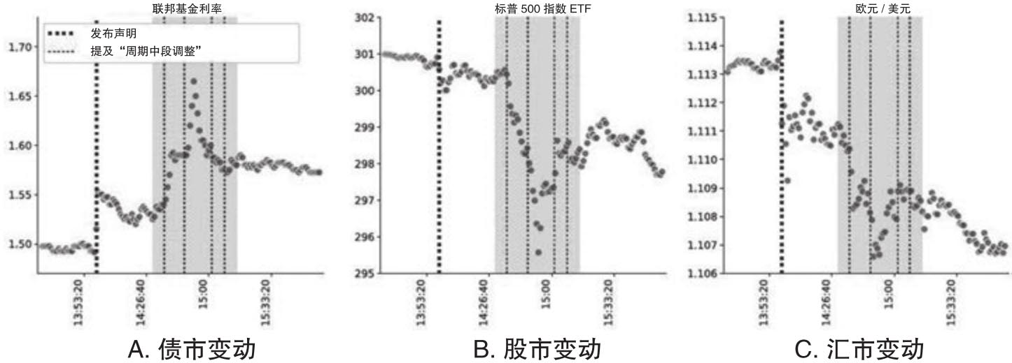 作为一个例证,作者特别讨论了2019年7月31日的FOMC会议。在当天FOMC会议结束前,市场预期联邦基金目标利率下跌35个基点,但是实际降息只有25个基点,这低于市场预期。与此同时,尽管投资者期待未来的货币政策会继续放松,但是联储会后发布的声明中有一句话给这种预期添加了不确定性:“委员会在考虑未来联邦基金利率目标区间的未来路径”。在会后进行的新闻发布会上,美联储主席Jerome Powell被在场记者反复提问声明中这句话的含义。当时Powell回答说:“我们正在考虑联邦基金利率目标区间的未来路径。……委员会的确认为这是对政策的周期中段调整(mid-cycle adjustment)。”而《美国市场》(US Markets)编辑Andrew Cinko马上指出:“周期中段调整意见表明未来不会继续降息。”现场直播的彭博社当时就援引了这一句话。图3.18就描述了债市(用12个月联邦基金利率期货的隐含利率衡量)、股市(用标普500指数ETF的价格)以及汇市(用欧元/美元汇率)的变动。图中表明,当发布会上每次提及“周期中段调整”那句话时,市场的一些投资者就在进行交易,同时市场价格会按照和声明发布时的方向进行调整。注意图中的黑色垂直粗虚线表示FOMC发布声明的时间,也就是14点,阴影区域表示FOMC新闻发布会的时间,它从14点30分开始持续了大约45分钟,而黑色虚线则显示了Powell主席数次提到“周期中段政策调整”的时间。
