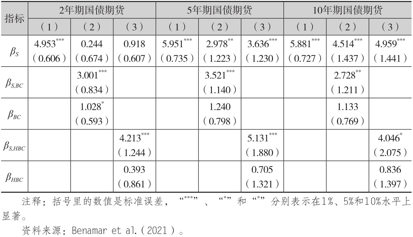 表3.5报告了上述三个方程分别针对2年期、5年期和10年期的回归结果。方程(1)的回归结果证明了一个经久的结论,这就是利率变动对于NFP意外是非常敏感的:以2年期国债期货为例,NFP意外增加一个标准差,那么2年期国债收益率将提升4.95个基点。给定平均修正久期等于1.71,这就意味着价格变动4.95×1.71=5.79个基点。[26]同时方程(2)的回归结果表明,对于2年期、5年期和10年期的国债期货市场而言,点击次数每增加一个标准差,敏感度系数就会分别提升3个基点、3.5个基点和2.7个基点。相比基准回归方程(1)的结果,这意味着显著的影响。当方程(3)使用高点击量哑变量作为自变量时,我们得到了和方程(2)类似的结果。这样表3.6表明当点击量高的时候,国债期货价格对非农就业意外的反应就更为强烈,而当点击量指标低的时候,这种反应就比较平淡。