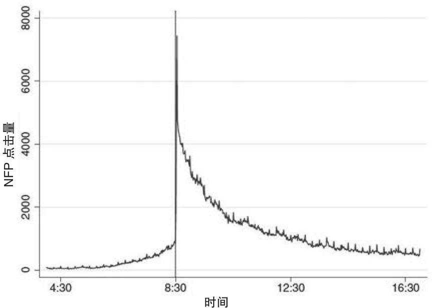 图3.20报告了在非农就业数据公告日从上午4点到下午5点(美国东部时间)的每分钟平均的NFP点击量。从中可以看出,这个指标在非农就业数据官宣之前逐渐增加,然后在官宣时间8点30分之后急剧上升,然后缓慢下降。