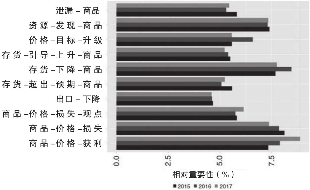 前面的分析表明如何把事件指标组合在一起产生超额收益也就是alpha,但是并没有说明哪些变量和哪些类型的事件对于超额收益有影响。作者还以随机森林模型为例说了这个问题。之所以采用随机森林模型,是因为它在样本外的绩效最好,同时它也提供了一种计算和分析特征变量重要性的清晰方法。图4.1报告了位列前十的事件类型重要性。[7]它表明和商品库存相关的事件类型是最重要的,例如“存货-下降-商品”这个事件。存货类的新闻事件对于价格影响发挥了重要作用,因为位列前十的事件类型中有三个和存货有关。此外,和供给相关的新闻事件对于价格变动也有影响。指向未来供给增加的资源发现类事件,以及让供给减少的泄漏类事件,都是影响期货价格的重要事件因素。