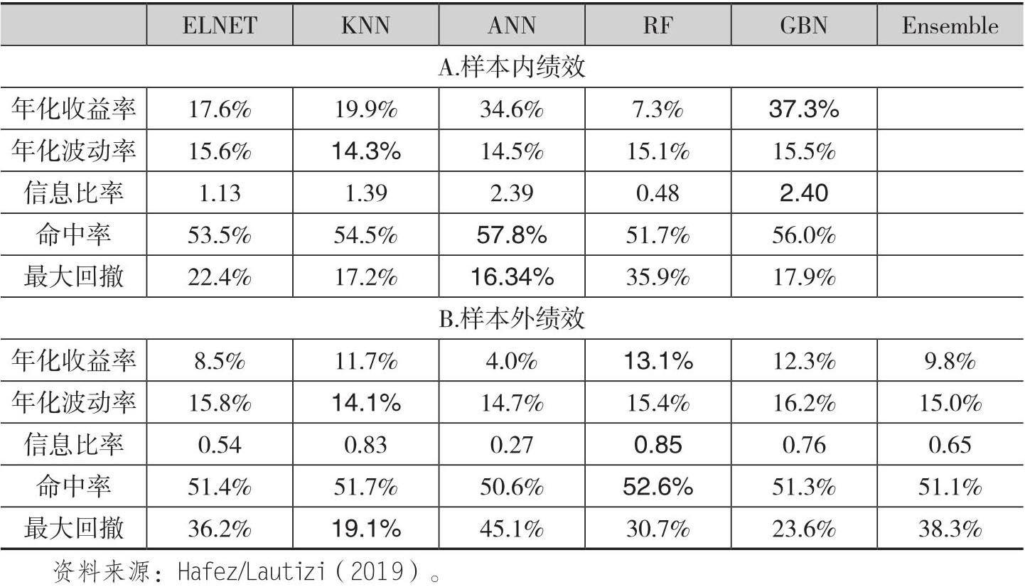 从表4.2中可以看到,样本内和样本外分析得到的最优模型存在着差异。如果是基于样本内分析进行,选择梯度增强树和人工神经网络模型,那么根据信息比率它们在样本外的绩效排名就是第三和最后一名,这表明了模型选择的风险。现在我们需要在这些模型中进行选择。一个直觉方法就是每年选择前一年表现最好的模型。但是表4.2的结果的差异表明依赖样本内选择的模型很可能会在样本外表现不佳。比如我们选择人工神经网络模型进行预测,那么样本外的绩效就是最差的。另外一种方法就是采用集成方法(ensemble method)。考虑对五种模型样本内和样本外绩效的差异,所以作者并没有根据交叉验证的误差确定权重,而是采用等权重的方式,也就是所在集成策略中,将根据五种模型的预测收益率通过等权重的方式组合在一起。表4.2B中的最后一列报告了集成方法的绩效,它的信息比率是0.65,年化收益率是9.8%。在对五种模型的相对绩效不存在先验知识的情况下,集成方法得到的投资绩效是有竞争力的,无论是绝对意义上的收益率还是风险调整的收益率。而且集成方法还可以降低模型选择风险,所以就降低可能存在的过拟合风险。