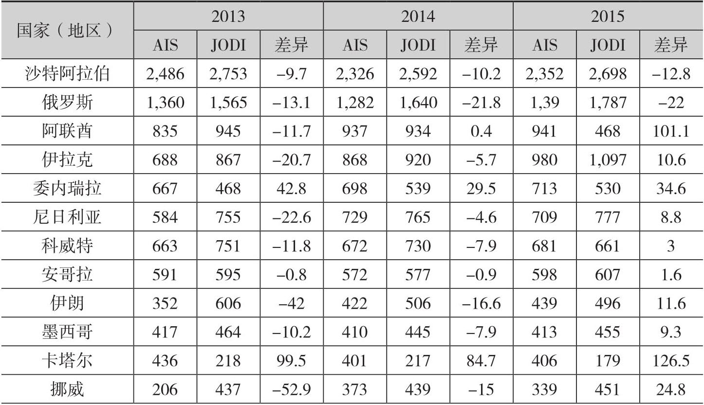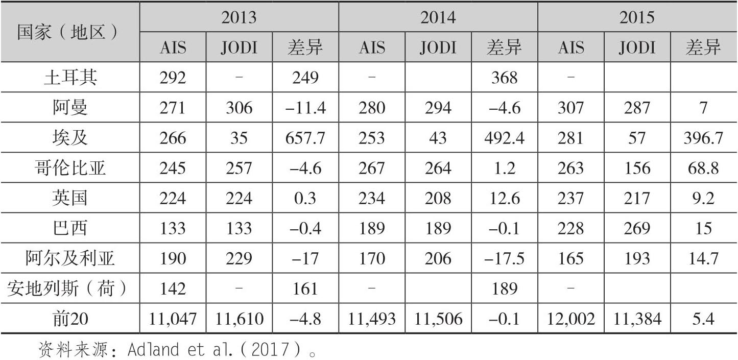 为了评估AIS数据对于出口估计的精准度,Adland等人将AIS的估计值和联合组织数据倡议(Joint Organization Data Initiative/JODI)的官方石油出口数据进行了比较。JODI的石油世界数据库(Oil World Database)是从欧盟统计局(Eurostat)、石油输出国组织(Organizaiton of the Petroleum Exporting Countries/OPEC)以及国际能源署(International Engery Agency/IEA)等诸多官方来源收集和整合的数据。表4.3对比了经由AIS得到的以及JODI公布的排名前20的海运原油出口国家(地区)以及原油出口量。
