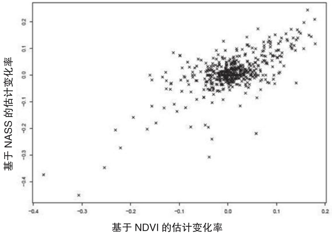 在这个预测方法中需要注意两点。首先,它没有把NASS的早期产量估计值纳入预测模型中,而是只使用了官方公布的最终产量估计值,这样做的目的是避免引入NASS的早期产量估计而带来过拟合的问题;其次,分析的时段分别在7月27日、8月28日和9月29日结束,因此就是在8月、9月和10月报告发布之前,这样就只能使用当时已知的NDVI数据来预测。图4.3报告了基于NDVI得到的产量估计变化率和NASS报告的产量估计变化率两者散点图,从中可以看出这两个变量是高度正向相关的:相关系数和秩相关系数分别为0.68和0.35,这两个数值在0.1%水平上都是显著的。这个结果充分说明基于NDVI形成的产量预测对于官方公布的产量预测有明显的指导意义。