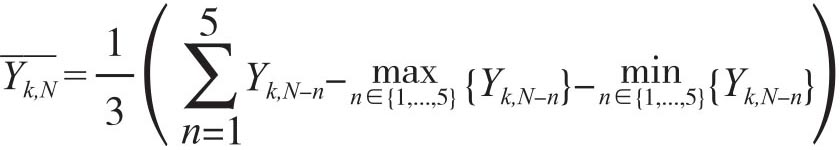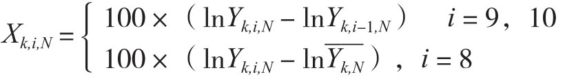 上式中,Yk,i,N表示早期的玉米产量估计值,下标k表示不同的州,包含前面提到的美国10个州;i表示官方报告的月份,也就是8月、9月和10月,而N表示样本年份。Yk,N表示政府针对州k在第N年的最终产量估计值,它是在后一年的1月份发布的。上式表明,在9月和10月的市场,新信息是两次报告期产量预测值的对数差;而对于8月而言,因为在这个月份NASS将针对本年度首次发布产出预测,因此它就等于本月的产量预测和前五年最终产量估计值的截断平均值之间的对数差。[14]