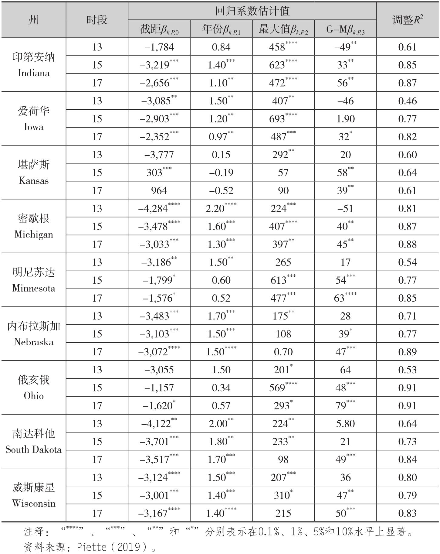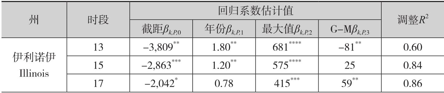 其中Yk,N表示州k在第N年的最终产量估计值。针对这个回归,作者针对每个州估计了时段P∈{13,15,17}的回归系数,结果如表4.5所示。从中可以看出,除了堪萨斯州以外,针对第17个时段(9月底)的模型在所有州的调整R2都超过0.80。同时除了堪萨斯州和威斯康星州以外,其他州的调整R2会随着作物生长季节而增加。以明尼苏达州为例,在7月底(第13个时段)模型的拟合优度是0.54,而到了8月底增加到0.77,最终在9月底达到了0.85。[15]