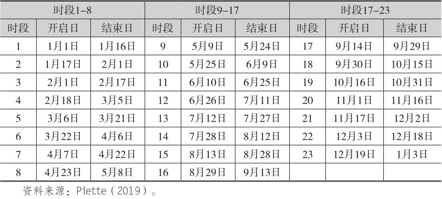 为了构建基于NDVI指数的产量预测模型,Piette首先定义Vk,P,N表示州k第N年第P个时段上的NDVI平均值,其中时段是根据表4.4中的日历周期进行定义的。这样基于NDVI的时间序列就可以针对时段9(5月9日到5月24日)到时段17(9月14日到9月29日)之间的所有时段定义如下两个指标:
