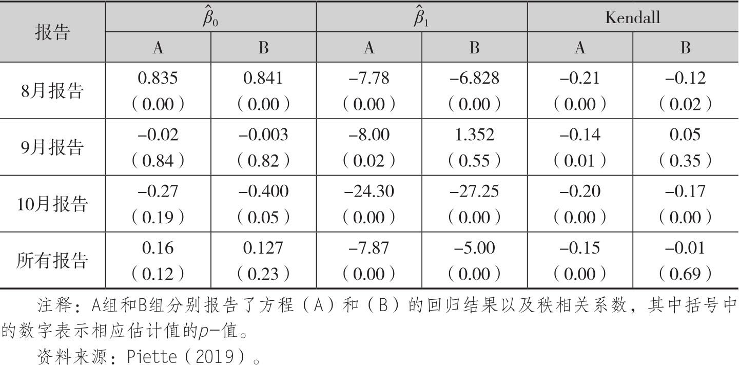 考虑到上述回归中并不能捕捉市场反应和政府报告之间的非线性关系,所以Piette还估计了r0,i,N、Xk,i,N、之间以及Kendall的秩相关系数。表4.6报告了统计分析结果。从中可以看出,期货价格不仅会对官方报告中的早期产量估计变化做出反应,而且这种反应和经济直觉方向一致,也就是β1的估计系数都是负数,这意味着做出产出预测的减少(增加)会导致商品期货价格的上升(下降)。当然我们可以看到这种关系的显著性在各个月份之间存在着差异。正如图4.2所示,这种效应在9月报告上不像8月和10月报告那么显著。[16]而B组的结果则表明,当考虑这三份报告时,