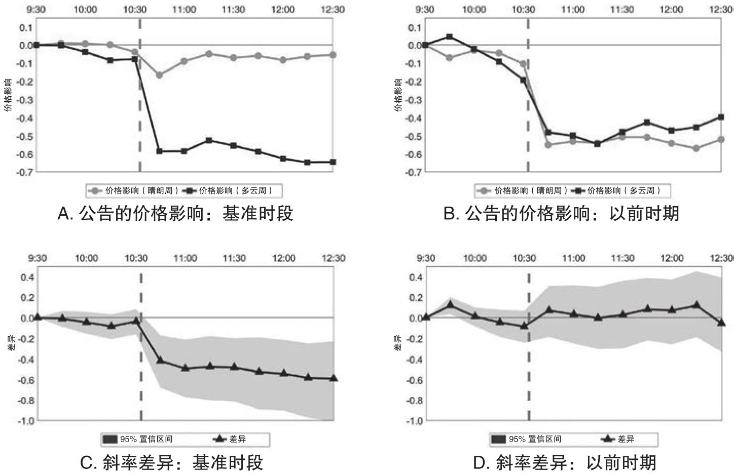 图4.5进一步对比了油价在基准时段和之前事前围绕EIA公告前后的价格模式。其中A图和B图分别报告了在基准时段和以前时期石油库存公告的价格影响,它们是通过不同时长的石油收益率对非预期石油库存进行回归得到的,这里计算石油收益率都是以早上9:30为起始时间,然后以15分钟为间隔延长计算收益率的时长,这体现在横轴的时间刻度上。图中的线1(2)反映的是晴朗周(多云周)的结果。C和D图则给出在基准时段和以前时期斜率估计值的差异,同时灰色区域表示估计值95%的置信区间。图中垂直的虚线时点是10:30分,这通常是EIA正式发布公告的时期。图4.5再一次证明了表4.5看到的结果,即在基准时段,油价针对库存公告的反应在多云周和晴朗周之间存在明显的差异,而这种差异在卫星数据尚未大规模应用之前的时期则不存在。