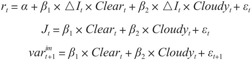 第一个是最主要的回归模型。左侧变量rt表示西德州原油期货近月合约在时点t的收益率,△It表示在时点t公布的原油库存非预期变化(也就是库存意外),它等于OI公司基于卫星的库存和EIA官方公布的库存之间差额绝对值和标准差之间的比率,这样这个指标的标准差就标准化为1,β1和β2可以分别解释为在晴天和阴天环境下石油库存意外每增加一个标准差所导致的回报率变动。Cleart和Cloudyt是两个哑变量,在晴朗周Cleart取值为1而Cloudyt取值为0;在多云周Cloudyt取值为1而Cleart取值为0。