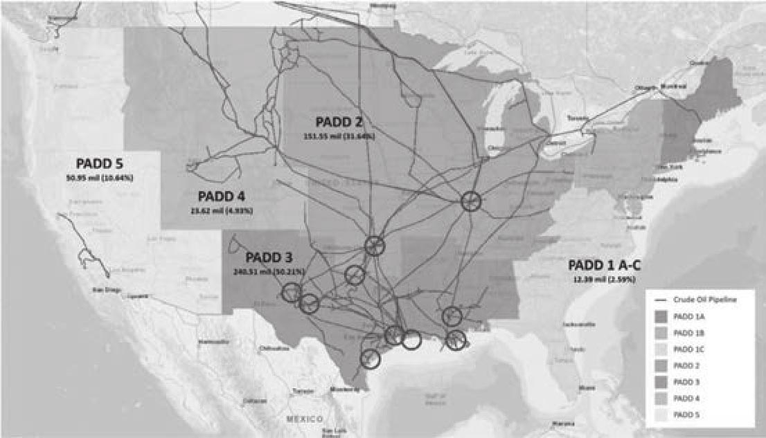 图4.4 美国五大PADD区域以及主要石油库存地点