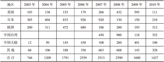 表2-11 2003~2010年世界各地区太阳能电池产量情况(单位:兆瓦)