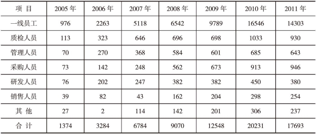 通过表2-9可以看出,尚德电力一线员工占总人数的80%左右,符合劳动密集型企业用工特点。根据《尚德可持续发展报告(2010)》中的数据显示,尚德电力员工的平均年龄为23岁,是非常有朝气的年轻生产团队。