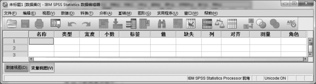 启动SPSS后,数据编辑器窗口中包含了两个子窗口——变量视图和数据视图,其中变量视图(如图3.1所示)就是用来定义数据结构的,其作用相当于一个十分详尽的编码表。如果调查时需要多个参与单位分别录入各自的调查数据,则可以将根据编码表编制好的变量视图模板发给每个参与单位,各个参与单位便可直接将数据录入到数据视图了。