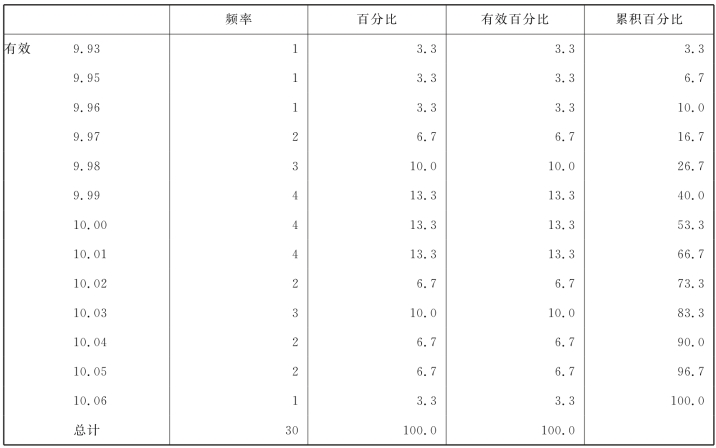③单击【继续】按钮,然后单击【确定】按钮,系统输出频率分布表的结果,如表3.1和表3.2所示。表3.1是有关样本平均值、中位数、合计的统计计算结果。表3.2是该样本数据集合的频率分布表,其中列出了不同样本值出现的频数、频率及其累积频率的统计结果。