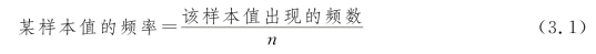例如,以例3.3为分析对象,按照上述原则,可以计算出各个(不重复的)样本值xi的频数、频率、有效频率,见表3.2的前4列。