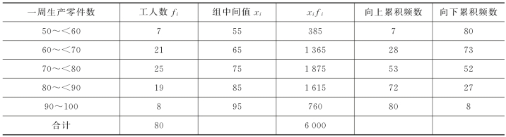 例3.5 某工厂抽样调查的职工生产情况如表3.4 所示,求工厂平均一周生产的零件数。