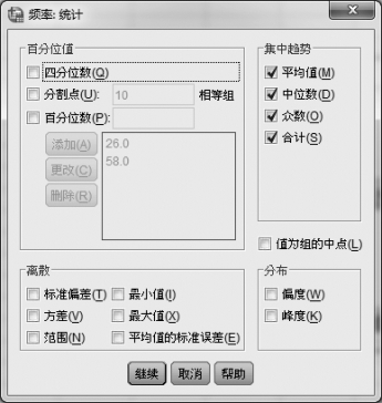 ②在频率分析模块对话框中,默认选中图3.5左下角的“显示频率表格”复选框,然后单击图3.5右上角的【Statistics】按钮。系统弹出频率分析模块的“频率:统计”对话框,选择平均值、中位数、众数、合计,如图3.9所示。