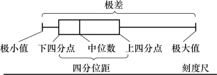 该方法简明地表达了样本数据的中心与离散特征,却又没有茎叶图和直方图那么详细,能够扼要地显示样本数据中心、范围、分布的主要特征(如偏斜程度)等,如图3.26所示。