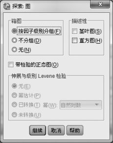 ①调入数据后,单击【分析】→【描述统计】→【探索】,用箭头将“身高”变量送入“因变量列表”框中。单击图3.20右上部的【绘图】按钮,选择“箱图”中的“按因子级别分组”。此时系统对话框如图3.27所示。