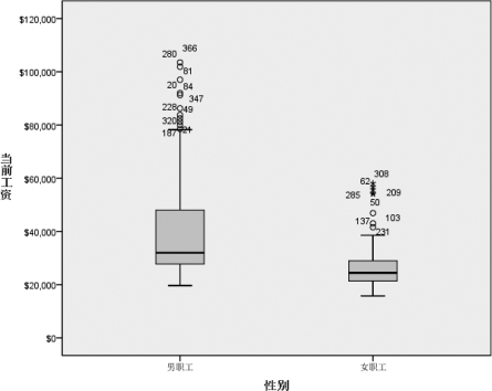 例3.13 针对数据文件“CH3 例3.13 箱图职工300余”,请绘制不同性别职工当前工资的箱形图。
