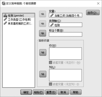 ②单击【定义】按钮,将“当前工资”送入“变量”框中,将“性别”送入“类别轴”中,如图3.31 所示。