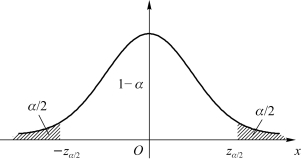 那么,就是总体均值μ的置信区间,而这里的zα/2是未知的。在概率统计的命名规则中,在一般情况下以临界值右侧的概率作为该临界值的下角标,如图4.8所示,服从标准正态分布的随机变量
