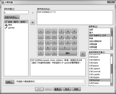 在这个“函数与特殊变量”框中选择“Cdf.Normal”函数,这时,这个框左侧的框中出现对这个函数的解释。用向上的箭头把这个函数送到上面的“数字表达式”框中。此时,“数字表达式”框中,出现函数CDF.NORMAL(?,?,?),这两步操作的结果如图4.10所示。