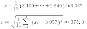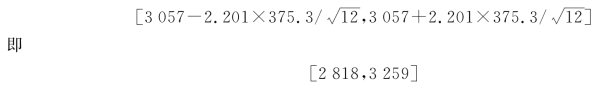 例4.6 假定初生婴儿(男孩)的体重服从正态分布,随机抽取12名婴儿,测得其体重分别(单位为g)为3100、2520、3000、3000、3600、3160、3560、3320、2880、2600、3400、2540。试以95%的置信水平估计新生男婴儿的平均体重区间。
