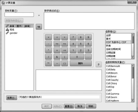 任意打开一个数据文件,在数据视图窗口中,单击【转换】→【计算变量】,系统弹出“计算变量”对话框,如图4.9所示。在这个对话框的右边,有一个“函数组”框,在这个框中有很多函数组,从中选出你所需要的函数组,完成相应的计算。例如,可以从随机变量X的取值边界x,计算出概率值p。也可以反过来,从概率值p,计算出x的值。这样,就免去了查表的麻烦。