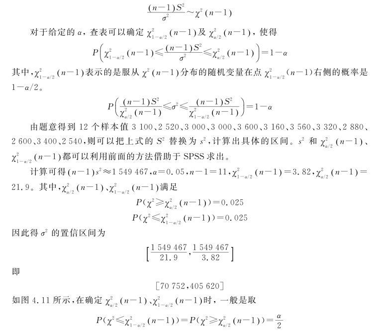 例4.8 假定初生男婴儿的体重服从正态分布,随机抽取12名婴儿,测得其体重(单位为g)分别为3100、2520、3000、3000、3600、3160、3560、3320、2880、2600、3400、2540,对婴儿体重的方差进行区间估计(a=0.05)。