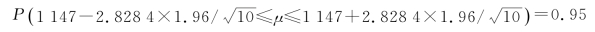 例4.5 假设某节能灯灯泡的寿命服从正态分布N(μ,8),从中抽取了10个节能灯灯泡进行寿命试验,得到的数据(单位为小时)如下:1050、1100、1080、1120、1200、1250、1040、1130、1300、1200,试找出平均寿命区间(α=0.05)。