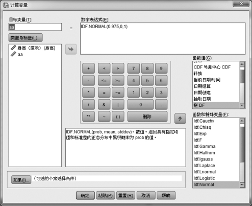 ②用SPSS计算。打开任意一个数据文件,然后单击【转换】→【计算变量】→【逆DF】→【IDF.NORMAL(0.975,0,1)】,如图5.2所示,可以得出zα/2≈1.96。