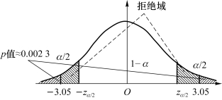 显然此时,若μ=32.50正确,我们拒绝它的概率只有0.05。由上一步知,z 的p 约为0.0023,这和是一致的。因此,由p 值≈0.0023<0.05,得结论否定H0,即不能认为这批糖果的平均袋装重量是32.50 g。