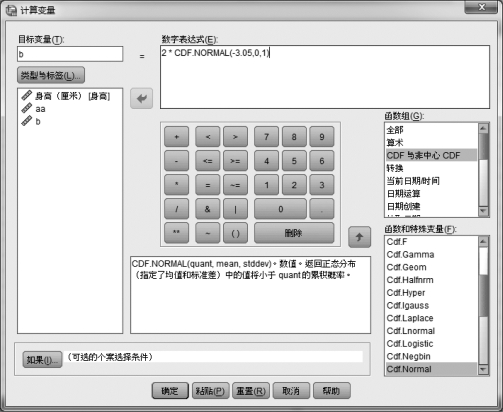 根据步骤2中求出的z≈-3.05,它左边的概率的2倍就是对应的p 值。利用SPSS计算,过程如下:打开任意一个数据文件,然后单击【转换】→【计算变量】→【CDF 与非中心CDF】→【2*CDF.NORMAL(-3.05,0,1)】,如图5.3所示。可以得出z的p 值约为0.0023。