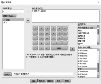 ①可以打开SPSS,单击【转换】→【计算变量】→【CDF 与非中心CDF】→【Cdf.T】,如图5.8所示,在“计算变量”对话框中录入图5.8中的数据,单击【确定】按钮,也可以查概率统计类教材后附带的t分布表,求出自由度为35的1.48的值对应的累积概率。