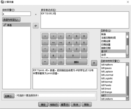 ①打开SPSS,单击【转换】→【计算变量】→【逆DF】,如图5.7所示,在对话框中录入图5.7中的数据,单击【确定】按钮,这样可以求出自由度为35的t分布的1-α=0.95的累积概率对应的临界值为1.6896。或者查概率统计类教材后的附表,找到t分布表,对应自由度为35,确定1-α=0.95的累积概率对应的临界值t0.05(35)为1.6896。