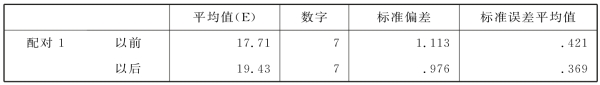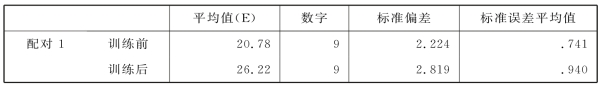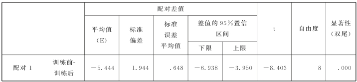 在表5.11中,观察t检验的最后结果,显著性(双尾)概率p=0.000<0.01,在SPSS输出窗口中,双击此处的“.000”,即可显示完整数值,本例为p=0.000031。由于是单尾检验,因此p 值=0.000031/2=0.0000155<0.0001<0.01,即t假设检验未通过,训练前、后的效果存在显著性差异。