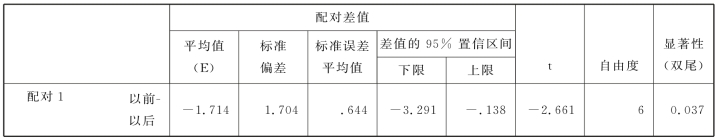 得p 值=0.037,因为本题是单尾检验,因此p 值=0.037/2=0.0185<0.05,即t检验假设“以前-以后=0”未通过,故方案实施前、后植株的高度存在显著性差异。说明该方案是有效的。