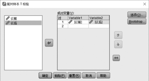 ①启动SPSS,输入数据后,单击【分析】→【比较平均值】→【配对样本T 检验】,屏幕上弹出一个对话框,从对话框的左框中选取要分析的变量“以前”和“以后”,单击箭头,将其分别放入右框“成对变量”中的“Variable1”和“Variable2”中,如图5.17所示。