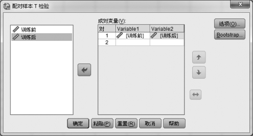 ①启动SPSS,输入数据后,单击【分析】→【比较平均值】→【配对样本T 检验】,屏幕上弹出一个对话框,从该对话框的左框中选取要分析的变量“训练前”和“训练后”,单击箭头,将其分别放入右框“成对变量”中的“Variable1”和“Variable2”中,如图5.16所示。