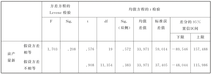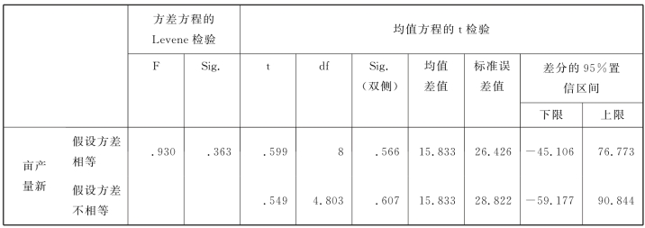 在表6.9中,第1个组合方差的Levene检验p=0.363>α=0.05,所以读取表6.9中的第一行结果,p=0.566>α=0.05,表示其组合的均值之间没有显著性差异,即试验田1和试验田4对油菜亩产量的影响无显著性差异。结果的不同反映了SPSS内部核心算法的不同。