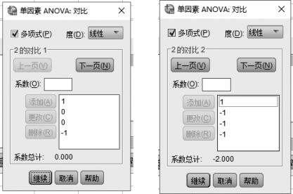 ④如果不是任何两个分别两两比较,而是某两个比较或多个分组比较,则可以单击【对比】按钮,弹出对比对话框(如图6.6所示)。单击该对话框中的“多项式”选项,“度”被激活,单击“度”右边的小箭头,出现下拉菜单,有线性、二次项、立方、四次项、五次项的多项式模型可供选择,一般选择线性模型。在“系数”的方框中,输入各组均值的系数,确定所要比较的组均值的组合。例如,输入1,再输入0,单击【添加】按钮,再分别输入0和-1,单击【添加】按钮,就完成了一个组合(1,0,0,-1),表示要对照检验“1=试验田1”的平均亩产量与“4=试验田4”的平均亩产量有无显著性差异。单击【下一页】按钮,再输入(1,-1,-1,-1),表示要对照检验“1=试验田1”的平均亩产量与“2=试验田2”“3=试验田3”“4=试验田4”之和的平均亩产量有无显著性差异。