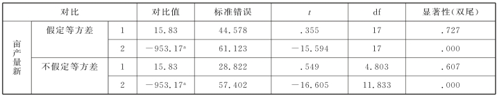 在表6.11中,第2个组合方差的Levene检验p=0.208>α=0.05,所以读取表6.11中的第一行结果,p=0.572>α=0.05,表示其组合的均值之间无显著性差异,即试验田1的均值和试验田2、3、4之和的均值对油菜亩产量的影响无显著性差异。