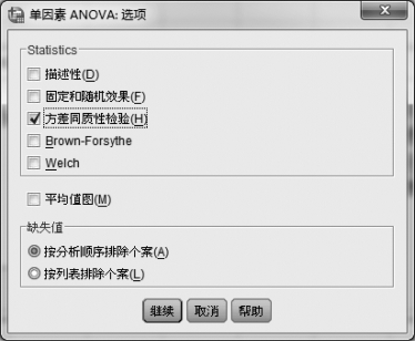 b.方差同质性检验:如果选择该选项,表示要进行方差齐次性检验(Levene检验),并输出检验结果。这一选择很重要,关系到“两两比较”对话框如何读取计算结果。本例选择此项。