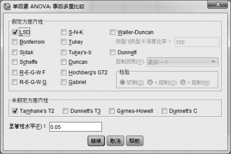 ②单击【继续】按钮,在单因素方差分析模块中单击【事后多重比较】按钮,如图6.5所示。在该对话框的“假定方差齐性”区块中,有14个选项,这些选项大体上是按照敏感性排列的。所谓敏感,是指较容易拒绝零假设(所有行的总体均值都相等的假说)。其中的第一个选项LSD(Least-Significant Difference)表示:当具有方差齐性时,在方差检验拒绝零假设(至少有一个水平的主效应不为0)的情况下,用最小显著性差异方法的t统计量,两两检验各组均值是否有显著性差异,同时不调整两两比较误差,本例选择此项。在该对话框的“未假定方差齐性”区块中,有4个选项,其中Tamhane's T2(在方差不相等、没有正态分布的前提下)的两两t检验,要看“单因素ANOVA:选项”对话框的“方差同质性Levene”检验的结果。在不具有方差齐性时,关注Tamhane's T2的结果。本例题选择此选项。