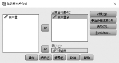 ②在单因素方差分析模块(如图6.3所示)中,选中左框的变量“亩产量新”放入右边的“因变量列表”框中。