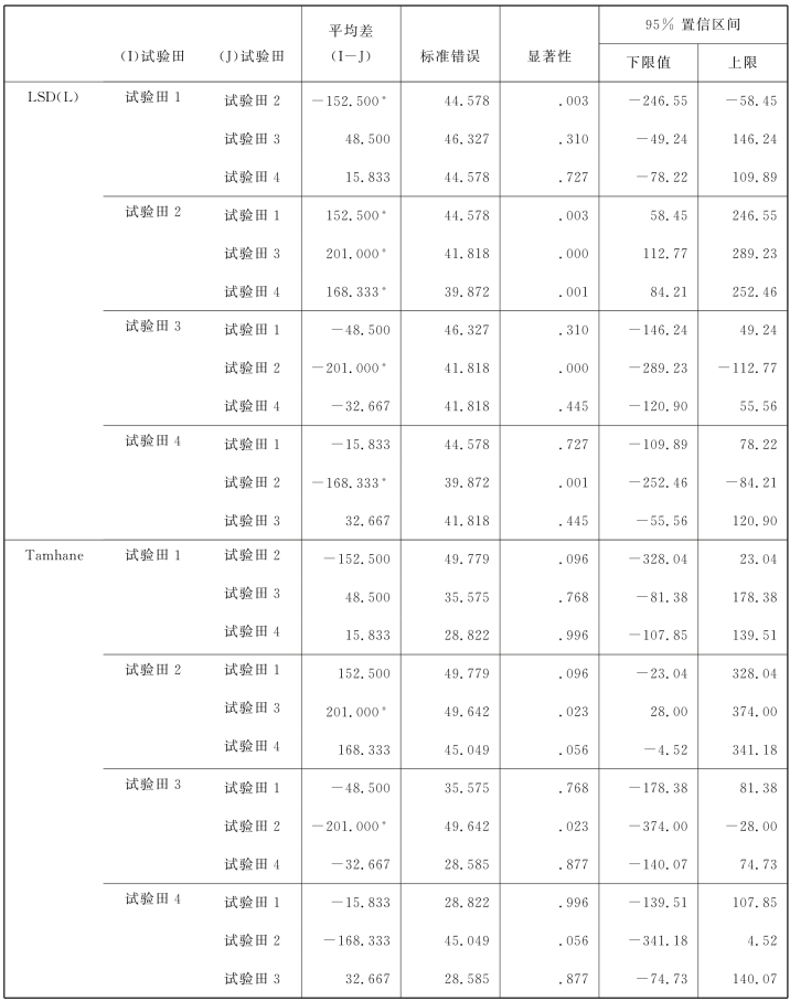 由于显著性概率p=0.014<α=0.05,表示4个组的数据都不具有方差齐性。这里的方差同质性检验请参照5.4.2节的内容。由于在前面的检验中,得知4块试验田方案下的亩产量平均值存在显著性差异,所以,在进行方差同质性检验之后,下面的表6.6给出了两两多重比较结果。