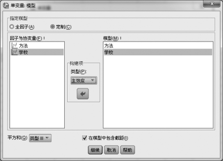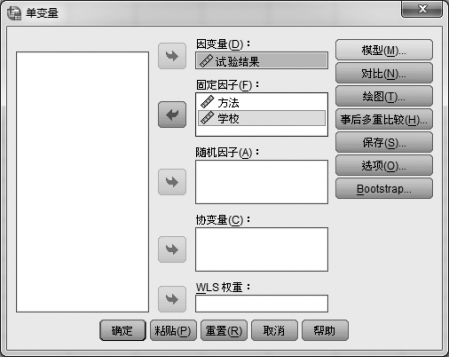 ③选中左框的变量“方法”和“学校”,放入右边的“固定因子”框中,如图6.7所示。