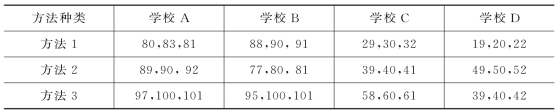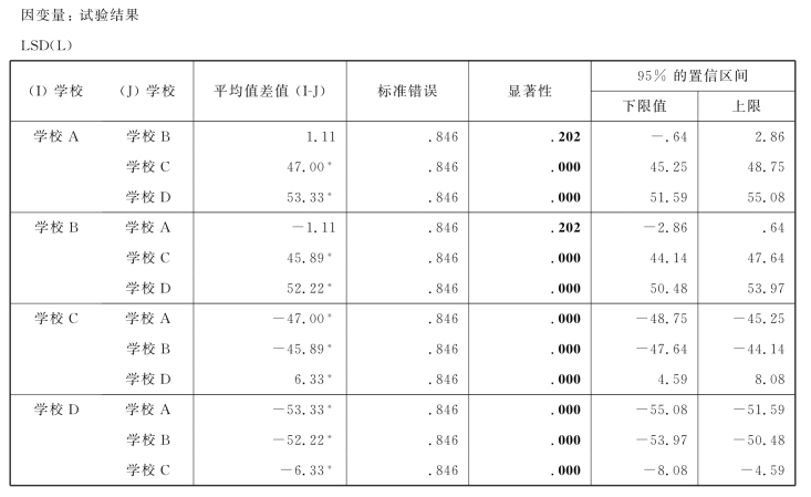 d.表6.18是学校的不同等级对教学效果的影响的两两多重比较的检验结果,从显著性概率来看,4个学校彼此之间的显著性概率也都小于0.05,所以学校的不同等级之间,除了学校A 和学校B 之间外,都存在显著性差异。
