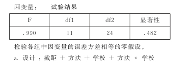 a.表6.15是方差齐性的检验结果,表中F 统计量的值为0.990,其显著性概率p=0.482>0.05,接受零假设,认为具有方差齐性。